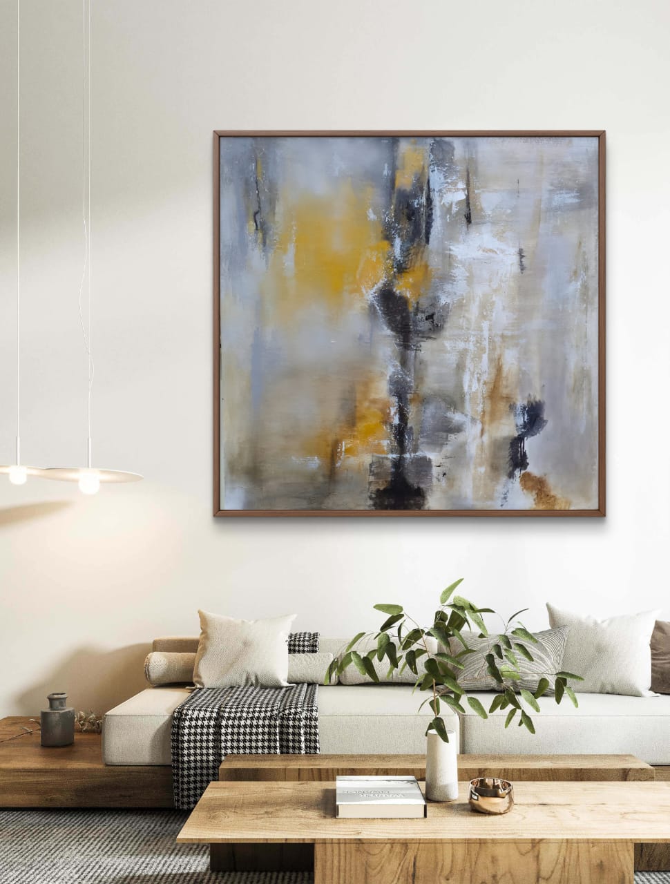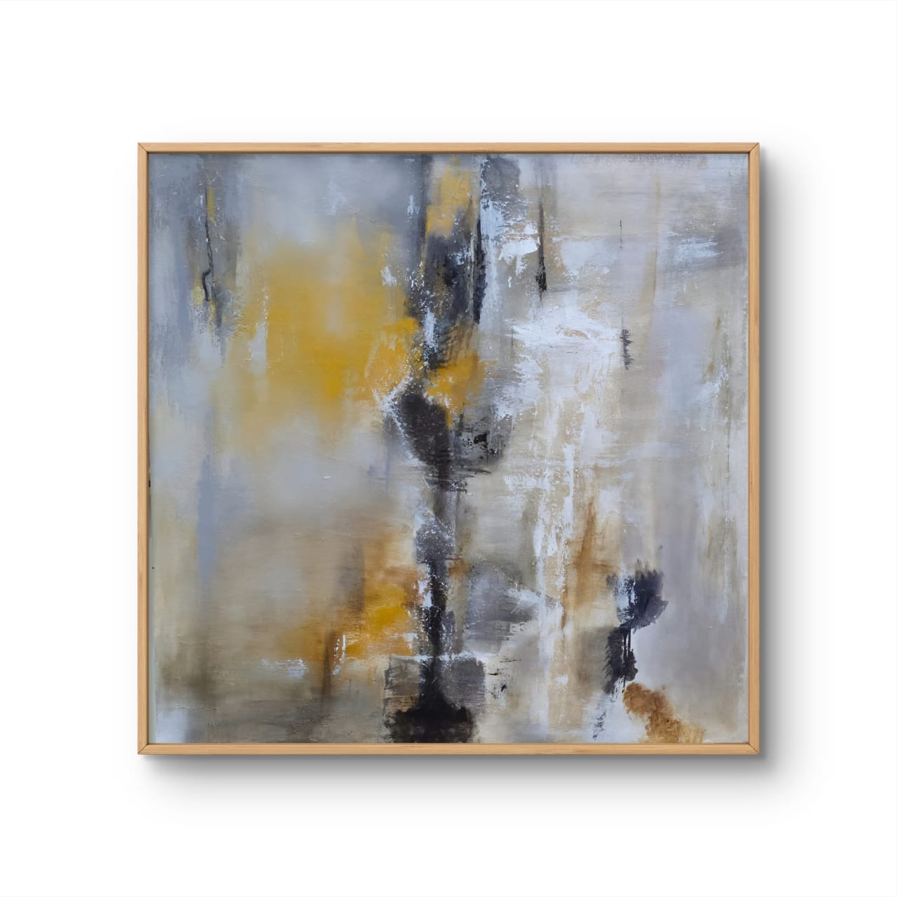 Elevate your space with "Monochrome Radiance," an exquisite abstract painting that seamlessly blends vibrant yellow, sophisticated grey, and bold black against a crisp white backdrop. This striking piece not only serves as a captivating focal point but also infuses your environment with a sense of modern elegance and creativity. Perfect for any room, it invites conversation and inspires imagination, making it an essential addition to your art collection.